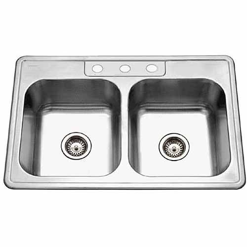 Houzer 3322-8BS3-1 Glowtone Series Topmount Stainless Steel 3-hole 50/50 Double Bowl Kitchen Sink, 8-Inch Deep