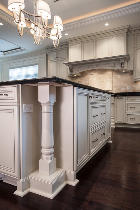 Kitchen remodel with white inset cabinets by Crystal on the perimeter and custom color on custom island cabinets. Perimeter cabinets feature White Princess granite and the Island has Labrodite Jade stone with a custom edge. Paint color in kitchen is by Benjamin Moore #1556 Vapor Trails. The trim is Benjamin Moore OC-21. The perimeter cabinets are prefinished by the cabinet manufacturer, white with a pewter glaze.