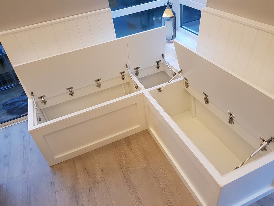 How to Build Banquette Bench Booth Seating In Your Kitchen Step 2: Remove baseboards. The baseboards in the corner of your kitchen will need to be removed in order to install your corner bench seating. The best way to remove baseboards is to run a utility knife along the top of the baseboard where your caulk line is. Next, use a pry bar and hammer to get it behind the baseboard and pry it off of the wall. ...