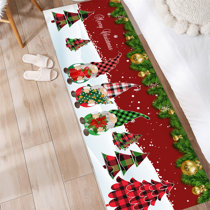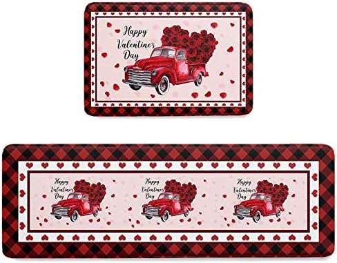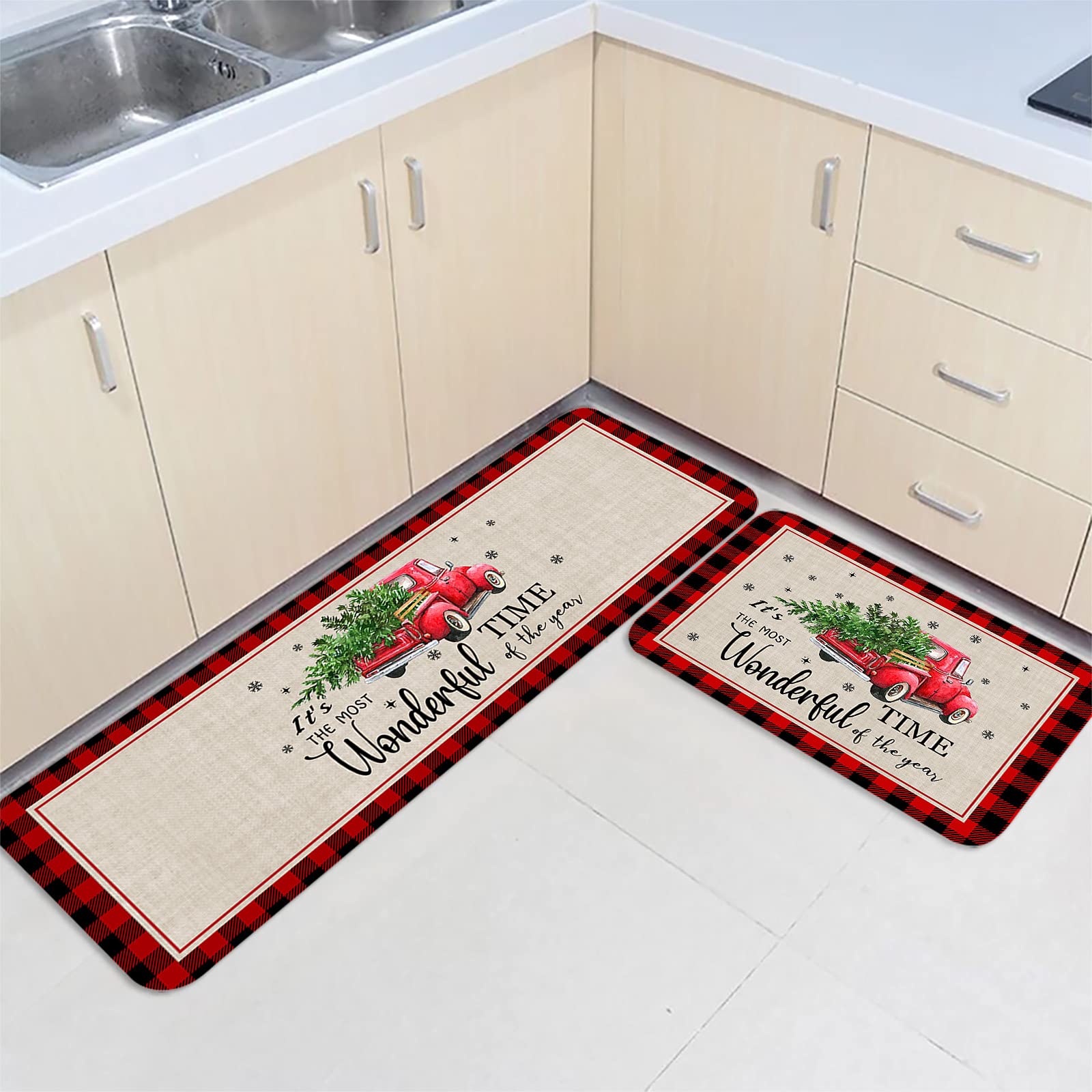 Kitchen Mat Set of 2 Ultra Soft Felt Rugs,It's The Most Wonderful Time of The Year A red Truck Carrying A Pine Tree in Grids Anti Fatigue Kitchen Rugs ...